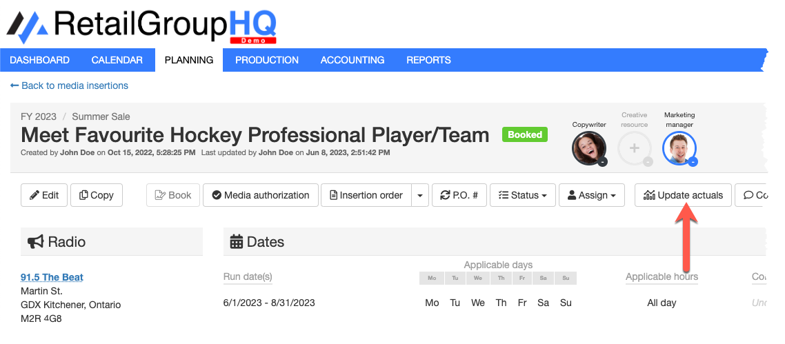 As a refresher, you can capture the actual costs on any given media insertion by clicking the "Update actuals" button: