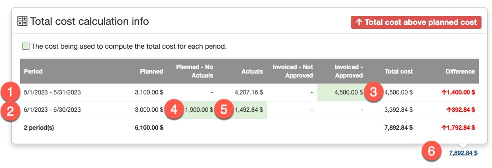The system organizes the cost calculation by the period following the invoice frequency. For each period, it highlights with a light green background the cost that is used for the forecast cost.